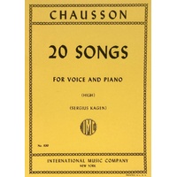 French and English. 20 songs by Ernest Chausson for high voice and pianoselected and edited by Sergius Kagen. Contents: Nocturne Nanny Amou r d'antan Le charme Printemps triste Les papillons Nos souvenirs Le derniere feuille Le temps des lilas Serenade Italienne Les h eures Le colibri Chanson d'Ophelia Serenade La chanson bien douce L'aveu Cantique a l'epouse La caravan Dans la foret Chanson perpetulle. 20 Songs Composer: Ernest Chausson Publisher: International Music Company Instrument: Voice Pages: 1
