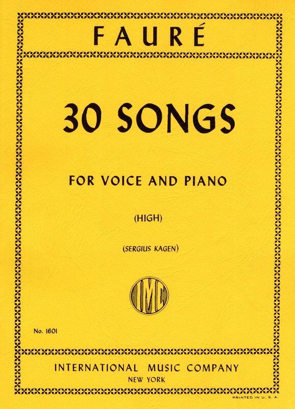 French and English. 30 songs by Gabriel Faure for high voice and piano selected and edited by Sergius Kagen. Contents: Reve d'amour Au cimetiere Aurore En sourdine Au bord de l'equ L'Hiver a cesse Les berceaux Les larmes Ici-bas Nell Automne Ap