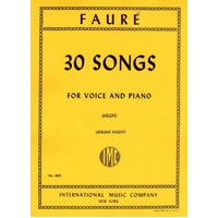 French and English. 30 songs by Gabriel Faure for high voice and piano selected and edited by Sergius Kagen. Contents: Reve d'amour Au cimetiere Aurore En sourdine Au bord de l'equ L'Hiver a cesse Les berceaux Les larmes Ici-bas Nell Automne Apres un Reve Green Les roses d'Ispahan La lune blanche Prison Rencontre Toujours Adieu Le secret Mandoline Clair de lune Fleur jetee Lydia Sylvia Dans les ruines d'une abbaye Mai Tristesse Chanson d'amour En priere. 30 Songs Composer: Gabriel Faure Publisher: International Music Company Instrument: Flute Pages: 128
