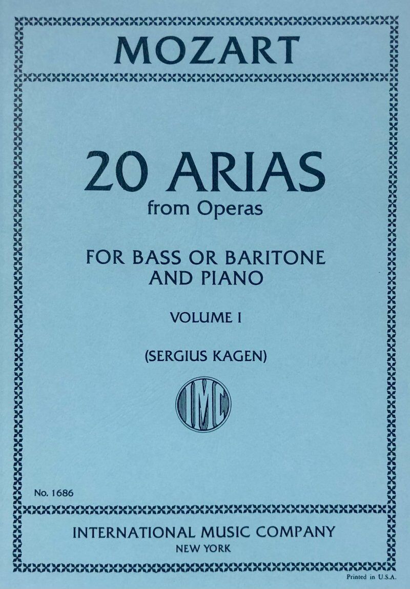 20 Mozart arias for Baritone or Bass and piano in two volumes. Volume 1 contains: Finch; han dal vino (Don Giovanni) Deh vieni alla finestra (Don Giovanni) Ho capito, Signor (Don Giovanni) Donne mie (Cosi fan tutte) A forza di martelli (La finta giard