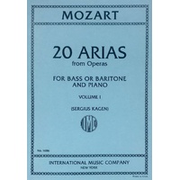 20 Mozart arias for Baritone or Bass and piano in two volumes. Volume 1 contains: Finch; han dal vino (Don Giovanni) Deh vieni alla finestra (Don Giovanni) Ho capito, Signor (Don Giovanni) Donne mie (Cosi fan tutte) A forza di martelli (La finta giardinera) Un marito, O Dio, vorresti (La finta giardinera) Non c'e al mondo (La finta semplice) Ella vuole ed io torrei (La finta semplice) Vieni, vieni, O mia Ninetta (La finta semplice) Nur mutig, mein Herze (Zaide). Arias from Operas Composer: Wolfgang Amadeus Mozart Publisher: International Music Company Instrument: Voice Pages: 1