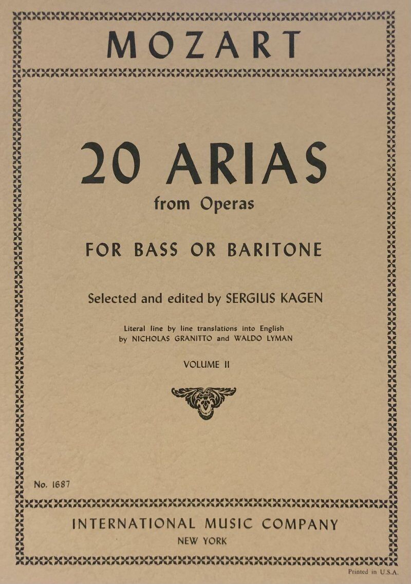 20 Mozart arias for Baritone or Bass and piano in two volumes. Volume 2 contains: Non pou andrai (Le nozze di Figaro) Se vuol ballare (Le nozze di Figaro) Vedro mentr'io (Le nozze di Figaro) Aprite un po' quegl' occhi (Le nozze di Figaro) Der Vogelfan