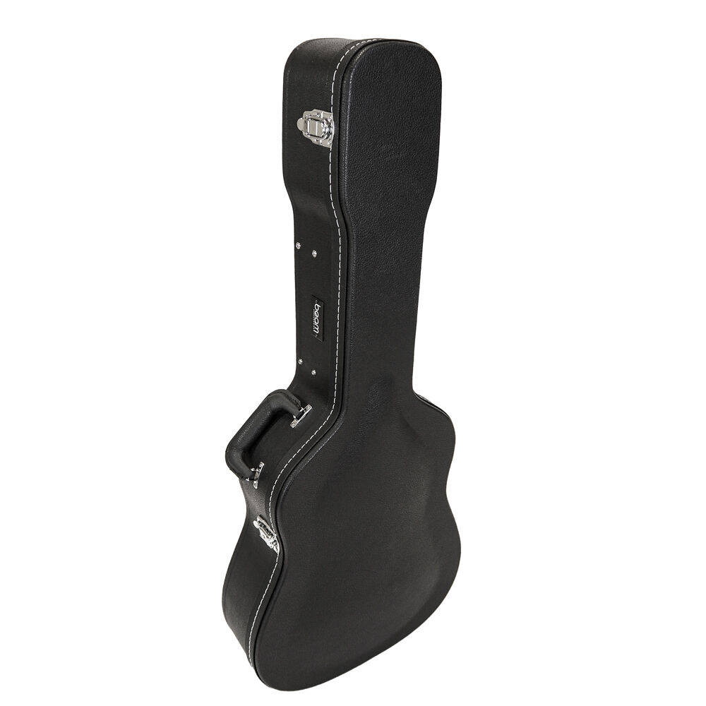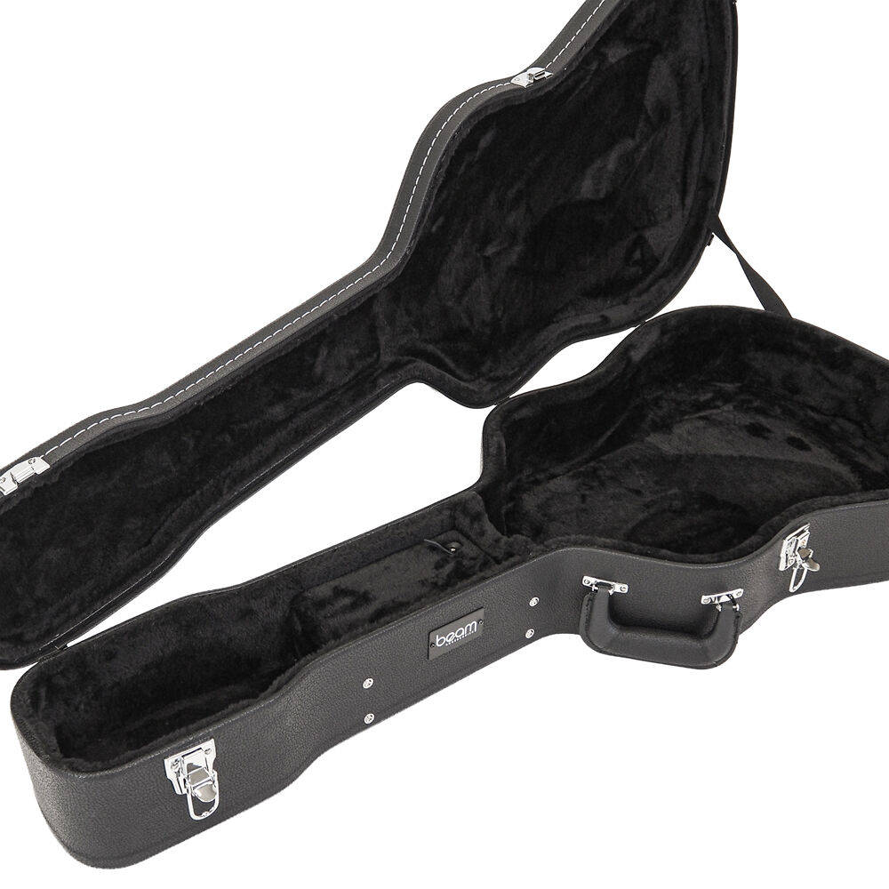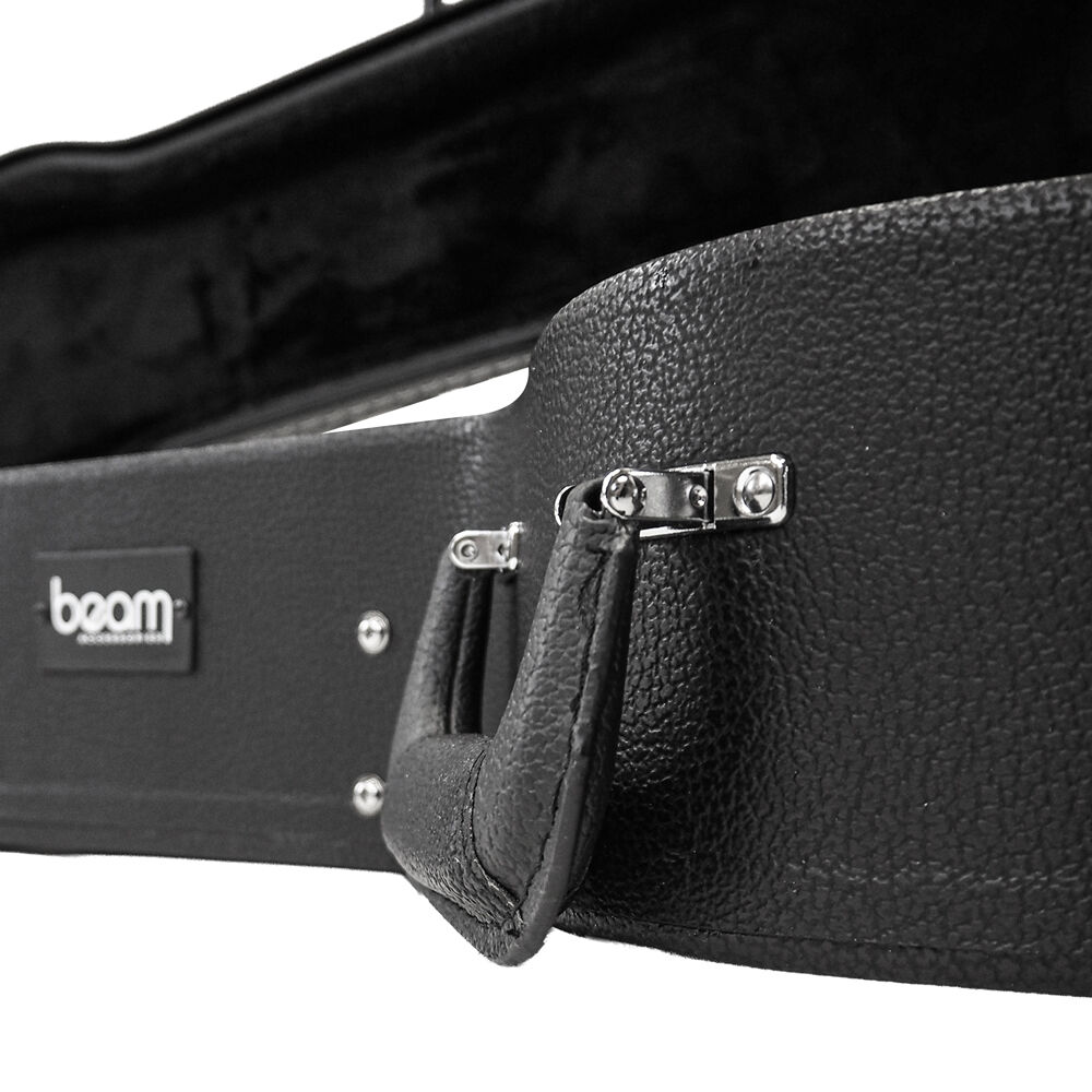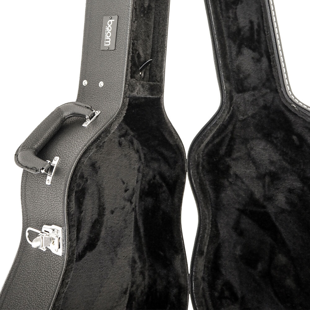 Protect your guitar in style with the Beam Accessories Premium Wood Dreadnought Guitar Case, designed for exceptional durability and timeless presentation. Inside and out, this case delivers professional-level protection and thoughtful features for guitarists who want their instrument to stay safe and secure. Premium Build and Outer Protection Constructed with tough plywood for excellent rigidity, this case protects your guitar from knocks, bumps, and environmental damage. Triple chrome-plated latches keep the lid tightly secured, and the case can be locked for extra peace of mind. The sleek black exterior with contrasting stitching gives it a refined, classic look. Interior Comfort and Support The interior is lined with soft plush fabric over foam padding, holding your guitar securely in place without scratches or movement. A built-in storage compartment provides space for essential accessories such as strings, tuners, or picks, keeping everything organised and within easy reach. Ergonomic and Practical Design Carrying is effortless with the padded ergonomic handle, ideal for transporting your guitar to lessons, rehearsals, or performances. The case is lightweight enough for travel while still maintaining strong structural protection. Specifications Internal body length: ~59.8 cm Body height: ~14cm Lower bout width: ~42 cm Middle bout width: ~31 cm Upper bout width: ~32 cm Overall length: ~109.2cm Exterior dimensions: ~ 113 × 49 × 16 cm Weight: ~5.7 kg