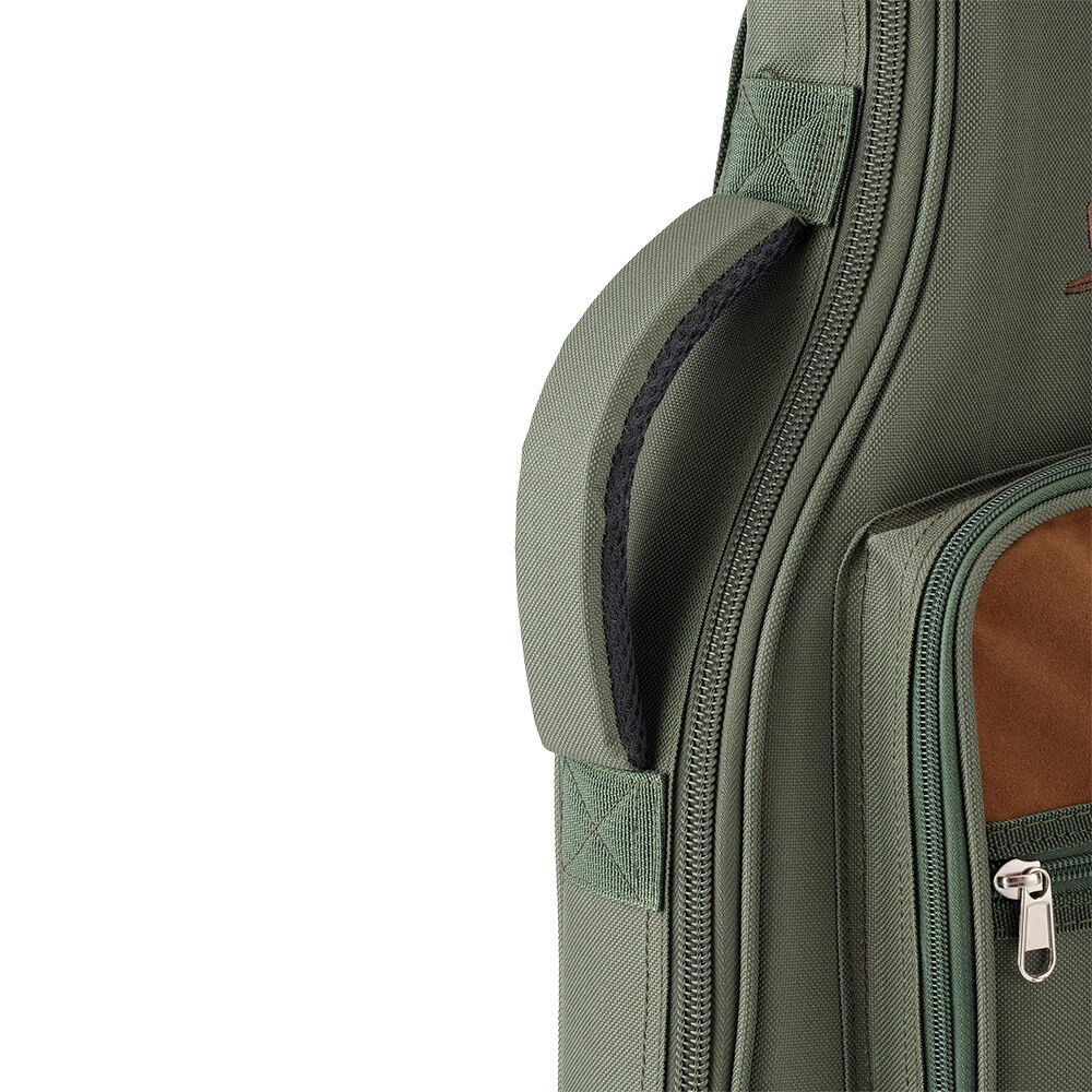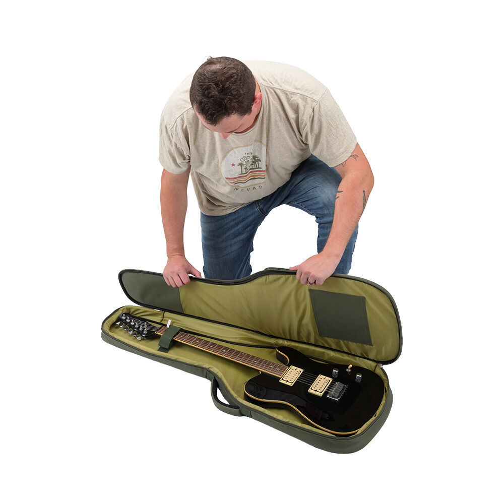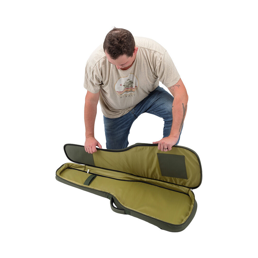 The case-like structure of the Adventure Series Gig Bag delivers robust protection, safe storage, and ease of transportation for an electric guitar, without the added weight of a hardshell case. The rugged, moisture-resistant 600D-nylon exterior, thick foam padding on all four sides, and smooth interior lining defend the instrument against dents, scratches, spills, and inclement weather. Plus, a hook-and-loop strap holds the neck firmly in place, preventing it from shifting during transportation. Three outer accessory compartments with zipper closures conveniently keep picks, capos, tuners, strings, and other tools and supplies organized and with the guitar. Two adjustable straps enable ergonomic backpack-style transportation while the padded top handle makes it easy to comfortably lift and carry like a traditional hardshell case. And the two-pull zipper keeps the instrument securely contained and opens and closes at either end or any point in between for efficient loading and unloading. FEATURES: Provides robust protection, safe storage, and ease of transportation for your electric guitar Defends your instrument from dings, dents, scratches, spills, and inclement weather Conveniently keeps your picks, capos, tuners, strings, and other tools and supplies with your guitar Enables you to ergonomically transport your instrument on your back while keeping your hands free Makes it easy for you to comfortably lift and carry your guitar Securely contains your instrument and opens and closes quickly for efficient loading and unloading Keeps your load light, maintaining the portability of your instrument Delivers hard-wearing strength for long-lasting service you can rely on SPECIFICATIONS: Application: Electric guitar Material: 600-D Nylon Padding Thickness: 0.79" (2 cm) Interior Depth: 2.5" (6.35 cm) Interior Length: 40" (101.6 cm) Interior Lower Bout Width: 13.5" (34.29 cm) Interior Upper Bout Width: 10.75" (27.30 cm) Number of Accessory Pockets: 3 Weight: 2.1 lb (0.96 kg) Colour: Green / Brown