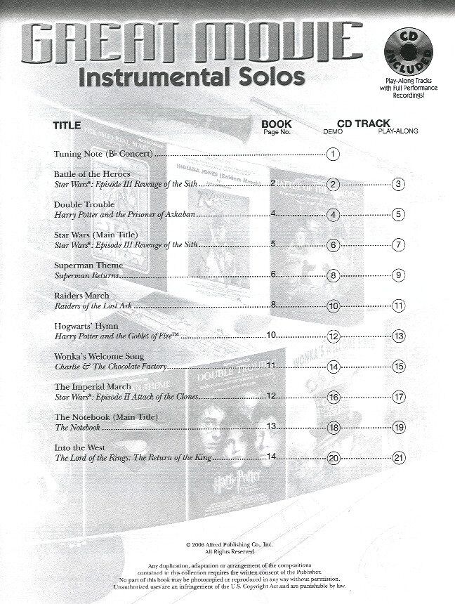 Titles are: Battle of the Heroes (from Star Wars: Episode III) * Double Trouble (from Harry Potter and the Prisoner of Azkaban) * Hogwart's Hymn (from Harry Potter and the Goblet of Fire) * Into the West (from The Lord of the Rings: The Return of the King) * Star Wars Main Title(from Star Wars: Episode III) * Imperial March (from Star Wars: Episode II) * Superman Theme (from Superman Returns) * Raiders March (from Raiders of the Lost Ark) * Wonka's Welcome Song (from Charlie and the Chocolate Factory) * The Notebook (from The Notebook). Great Movie Instrumental Solos for Alto Saxophone Publisher: Alfred Music Instrument: Saxophone Pages: 16