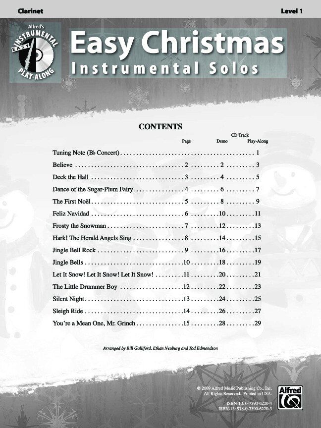 Play along with your favorite popular and traditional Christmas songs. Arranged specifically for the Level 1 player, this book comes with a play-along recording, which includes a backing and performance track for each title. An optional piano accompaniment book is available for wind instruments. Titles: Believe * Dance of the Sugar-Plum Fairy * Deck the Hall * Feliz Navidad * The First Noel * Frosty the Snowman * Hark! The Herald Angels Sing * Jingle Bell Rock * Jingle Bells * Let It Snow! Let It Snow! Let It Snow! * The Little Drummer Boy * Silent Night * Sleigh Ride * You're a Mean One, Mr. Grinch. This title is available in MakeMusic Cloud. Easy Christmas Instrumental Solos Level 1 - Clarinet Publisher: Alfred Music Instrument: Clarinet Pages: 16 Series: Easy Instrumental Solos Series