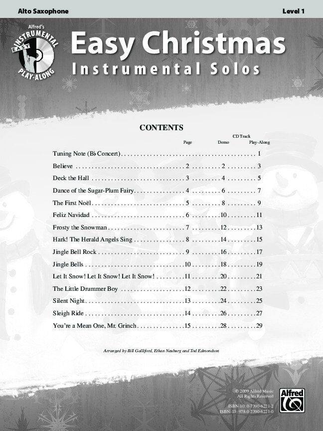 Play along with your favorite popular and traditional Christmas songs. Arranged specifically for the Level 1 player, this book comes with a play-along recording, which includes a backing and performance track for each title. An optional piano accompaniment book is available for wind instruments. Titles: Believe * Dance of the Sugar-Plum Fairy * Deck the Hall * Feliz Navidad * The First Noel * Frosty the Snowman * Hark! The Herald Angels Sing * Jingle Bell Rock * Jingle Bells * Let It Snow! Let It Snow! Let It Snow! * The Little Drummer Boy * Silent Night * Sleigh Ride * You're a Mean One, Mr. Grinch. This title is available in MakeMusic Cloud. Easy Christmas Instrumental Solos Level 1 - Alto Sax Publisher: Alfred Music Instrument: Saxophone Pages: 16 Series: Easy Instrumental Solos Series