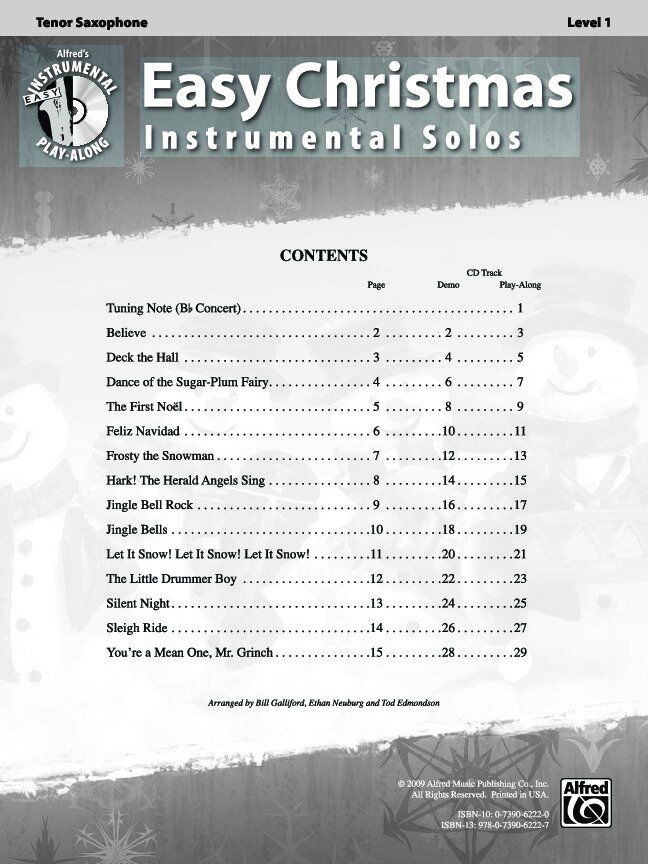 Play along with your favorite popular and traditional Christmas songs. Arranged specifically for the Level 1 player, this book comes with a play-along recording, which includes a backing and performance track for each title. An optional piano accompaniment book is available for wind instruments. Titles: Believe * Dance of the Sugar-Plum Fairy * Deck the Hall * Feliz Navidad * The First Noel * Frosty the Snowman * Hark! The Herald Angels Sing * Jingle Bell Rock * Jingle Bells * Let It Snow! Let It Snow! Let It Snow! * The Little Drummer Boy * Silent Night * Sleigh Ride * You're a Mean One, Mr. Grinch. This title is available in MakeMusic Cloud. Easy Christmas Instrumental Solos Level 1 - Tenor Sax Publisher: Alfred Music Instrument: Saxophone Pages: 16 Series: Easy Instrumental Solos Series
