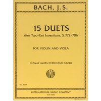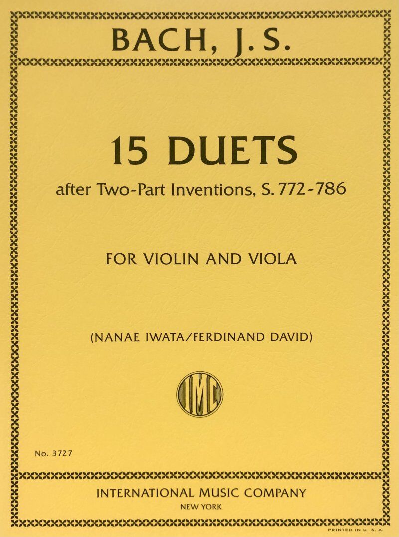 Composed by Johann Sebastian Bach (1685-1750). Arranged by Nanae Iwata / Ferdinand David. Parts. 15 Duets after Two-Part Inventions BWV 772-786 Composer: Johann Sebastian Bach Arranger: Ferdinand David Publisher: International Music Company Instrument: Violin|Viola Format: String Duo Pages: 28