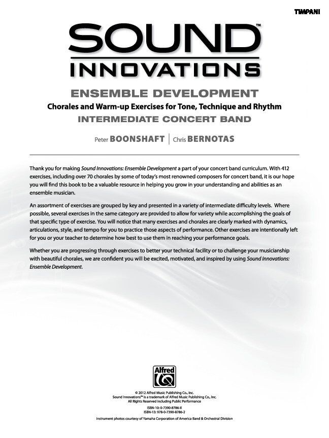 Sound Innovations: Ensemble Development is a valuable resource for helping your students grow in their understanding and abilities as ensemble musicians. It contains 412 exercises, including more than 70 chorales by some of today's most renowned concert band composers. An assortment of exercises is grouped by key and presented in a variety of intermediate difficulty levels. Where possible, several exercises in the same category are provided to allow variety, while still accomplishing the goals of that specific type of exercise. You will notice that many exercises and chorales are clearly marked with dynamics, articulations, style, and tempo for students to practice those aspects of performance. Other exercises are intentionally left flexible for the teacher to determine how best to use them in facilitating and addressing the needs and goals of their ensemble. Whether your students are progressing through exercises to better their technical facility, or challenging their musicianship with beautiful chorales, this book can be used after any band method or as a supplement to performance music. Contains chorales composed by Roland Barrett, Andrew Boysen, Ralph Ford, Rossano Galante, Robert Sheldon, Todd Stalter, Randall Standridge, and Michael Story. This title is available in SmartMusic. Sound Innovations: Ensemble Development - Timpani Composer: Chris Bernotas|Peter Boonshaft Publisher: Alfred Music Instrument: Tuned Percussion Pages: 56 Series: Sound Innovations for Concert Band: Ensemble Development