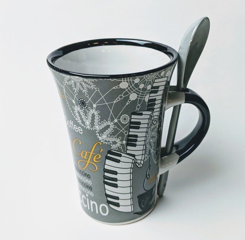 An ideal gift for a pianist or music enthusiast, this grey Cappuccino Mug is decorated with a bold pattern featuring the image of a Piano and coffee-related words. A matching spoon, which can be stored in the handle of the mug, is also included. This Capp