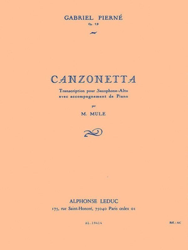 Canzonetta, Op. 19 is a piece for Alto Saxophone and Piano accompaniment composed by Gabriel Pierné and arranged by Marcel Mule. Initially written for Clarinet and Piano, the piece was written in 1888 and can be played by advanced players with a fa