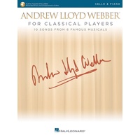 Intermediate level arrangements for solo instruments and piano accompaniment, in a range flattering to each instrument. The music has been edited with added dynamics, articulations, and phrasing, making it appropriate for lessons or performances. The accompaniments have been recorded on an acoustic grand piano and are available online for download or streaming. Includes: Memory from Cats • Don't Cry for Me Argentina from Evita • Hosanna from Jesus Christ Superstar • I Don't Know How to Love Him from Jesus Christ Superstar • The Last Supper from Jesus Christ Superstar • CLose Every Door from Joseph and the Amazing Technicolor Dreamcoat • All I Ask of You from The Phantom of the Opera • Angel of Music from The Phantom of the Opera • The Music of the Night from The Phantom of the Opera • Unexpected Song from Song & Dance. Andrew Lloyd Webber for Classical Players - Cello/Piano Publisher: Hal Leonard Instrument: Cello Pages: 56 Series: Songs for Classical Players