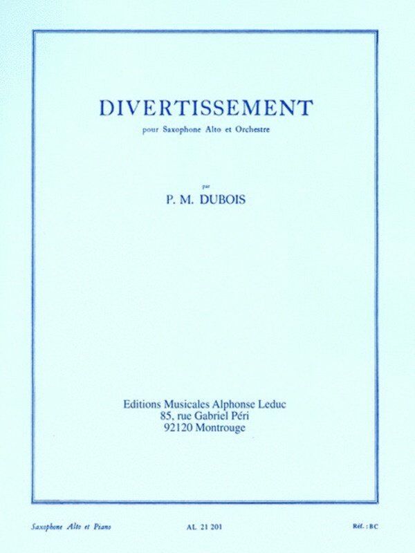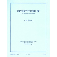 French composer, Pierre Max Dubois (1930-1995) significantly contributed to the woodwind repertoire, particularly for Saxophone. Divertissement for Alto Saxophone was published in 1953 and remains popular in advanced saxophonists' repertoire. Dubois' music is characteristically light-hearted with unusual harmonic and melodic textures. 'Divertissement' for Alto Saxophone and Piano reduction is made up of three movements; 1) Allegro vivo, 2) Lent et doux, and 3) Scherzando. Essential to the advanced saxophonists' repertoire, Dubois' 'Divertissement' makes for an exciting and enjoyable performance for players and audiences alike. Divertissement Composer: Pierre-Max Dubois Publisher: Alphonse Leduc Instrument: Saxophone